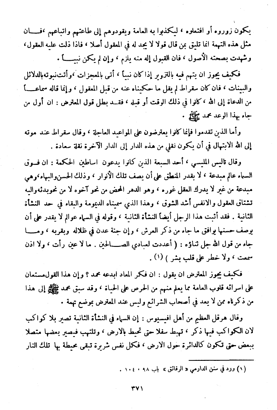فكيف يجوز المعترض أن يقول: أن فكر المعاد أبدعه محمد؟ وإن هذا القول مستعان على أسرائه قلوب العامة مما يعلم منهم من الحرص على الحياة، وقد سبق محمد صلى الله عليه وسلم إلى هذا من ذكرناه ممكن لا يعد في أصحاب الشرائع وليس عند المعترض بموضع تهمة.
