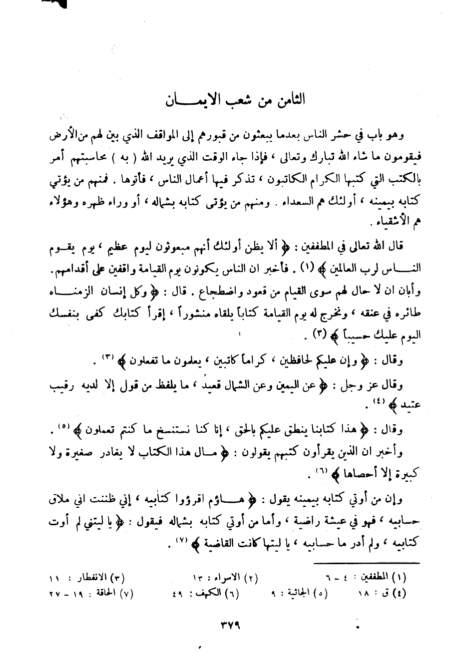 وهو باب في حشر الناس بعدما يبعثون من قبورهم إلى المواقف الذي بين لهم من الأرض فيقومون ما شاء الله تبارك وتعالى، فإذا جاء الوقت الذي يريد الله (به) محاسبتهم أمر بالكتب التي كتبها الكرام الكاتبون، تذكر فيها أعمال الناس، فأتوها. فمنهم من يؤتي كتابه بيمينه، أولئك هم السعداء. ومنهم من يؤتى كتابه بشماله، أو وراء ظهره وهؤلاء هم الأشقياء.