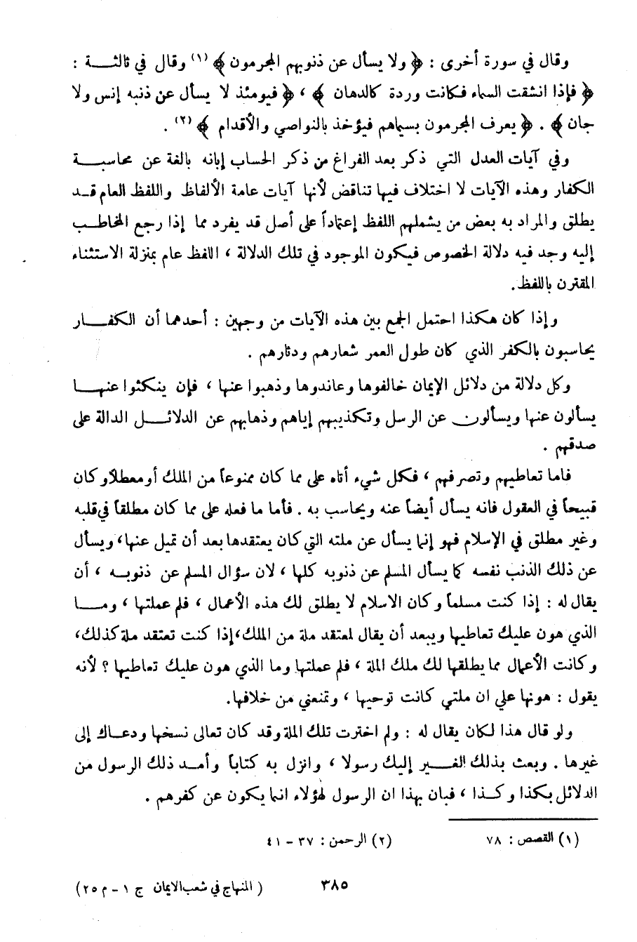 وفي آيات العدل التي ذكر بعد الفراغ من ذكر الحساب إبانه بالغة عن محاسبة الكفار وهذه الآيات لا اختلاف فيها تناقض لأنها آيات عامة الألفاظ واللفظ العام قد يطلق والمراد به بعض من يشملهم اللفظ اعتمادا على أصل قد يفرد مما إذا رجع المخاطب إليه وجد فيه دلالة الخصوص فيكون الموجود في تلك الدلالة، اللفظ عام بمنزلة الاستثناء المقترن باللفظ.