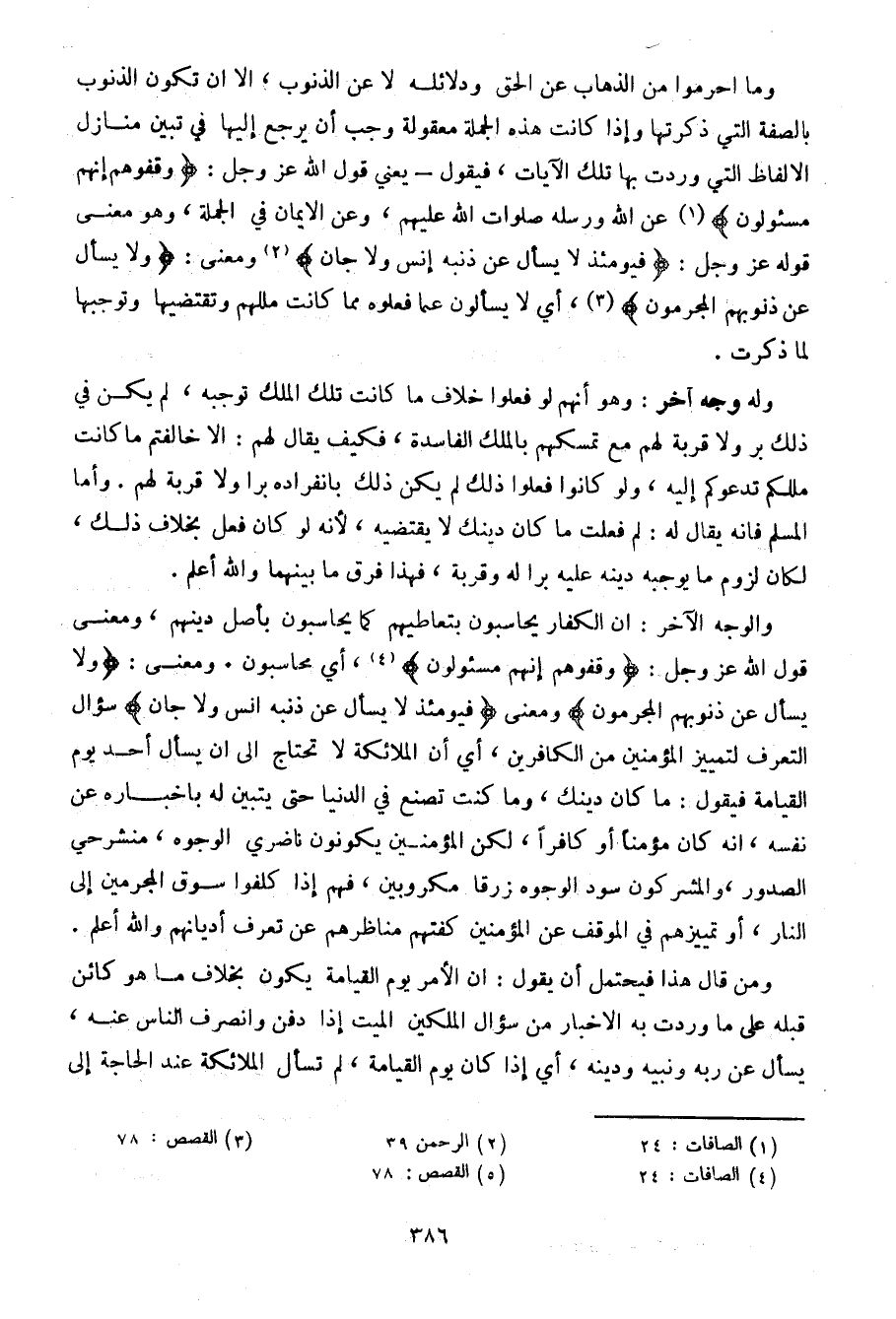 والوجه الآخر: أن الكفار يحاسبون بتعاطيهم كما يحاسبون بأصل دينهم، ومعنى قول الله عز وجل: {وقفوهم إنهم مسئولون}، أي محاسبون. ومعنى: {ولا يسأل عن ذنوبهم المجرمون} ومعنى {فيومئذ لا يسأل عن ذنبه إنس ولا جان} سؤال التعرف لتمييز المؤمنين من الكافرين، أي أن الملائكة لا تحتاج إلى أن يسأل أحد يوم القيامة فيقول: ما كان دينك، وما كنت تصنع في الدنيا حتى يتبين له بأخباره عن نفسه، أنه كان مؤمنا أو كافرا، لكن المؤمنين يكونون ناضري الوجوه، منشرحي الصدور، والمشركون سود الوجوه زرقا مكروبين، فهم إذا كلفوا سوق المجرمين إلى النار، أو تمييزهم في الوقف عن المؤمنين كفتهم مناظرهم عن تعرف أديانهم والله أعلم.