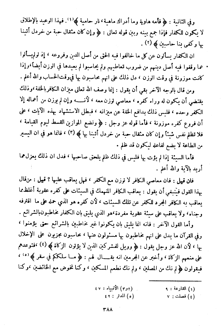 وفي الثانية: {فأمه هاوية وما أدراك ما هية، نار حامية}. فهذا الوعيد بالإطلاق لا يكون للكفار فإذا جمع بينه وبين قوله تعالى: {وإن كان مثقال حبة من خردل أتينا بها وكفى بنا حاسبين}.
