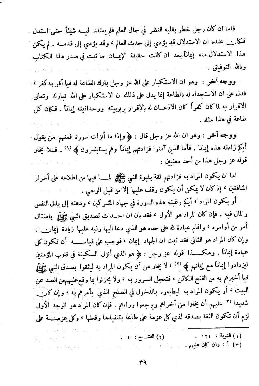 وإن كان المراد هو الثاني فقد ثبت أن الجهاد إيمان، فوجب على قياسه أن تكون كل عبادة إيمانا. وهكذا قوله عز وجل: {هو الذي أنزل السكينة في قلوب المؤمنين ليزدادوا إيمانا مع إيمانهم}، لا يخلو من أن يكون المراد به ليثقوا بصدق النبي صلى الله عليه وسلم فيما أخبرهم به من الفتح الكائن، فتعجل السرور به، ولا يحزنوا بما وقع عليهم من الصد عن البيت، أو يكون المراد به ليطيعوه بالدخول في الصلح الذي يأمرهم به، وإن كان شديدا عليهم أن يخلوا من أخراهم ويرجعوا وراءهم. فإن كان المراد هو الوجه الأول لزم أن تكون الثقة بصدقه لذي كل عزمة على طاعة بتنفيذها وفعلها، وكل عزمة على