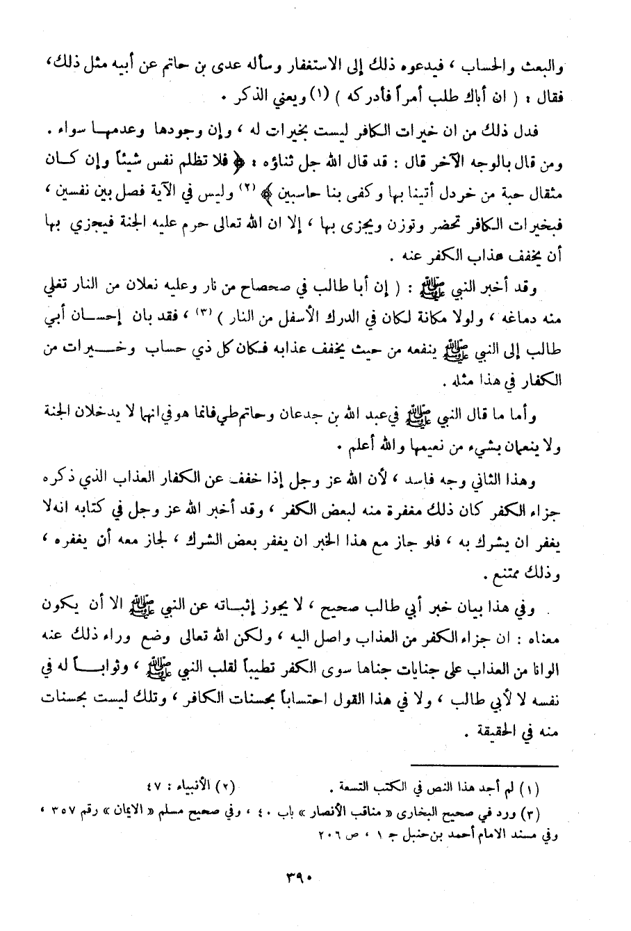 وقد أخبر النبي صلى الله عليه وسلم: {إن أبا طالب في صحصاح من نار وعليه نعلان من النار تغلي منه دماغه، ولولا مكانة لكان في الدرك الأسفل من النار}، فقد بان إحسان أبي طالب إلى النبي صلى الله عليه وسلم ينفعه من حيث يخفف عذابه فكان كل ذي حساب وخيرات من الكفار في هذا مثله.