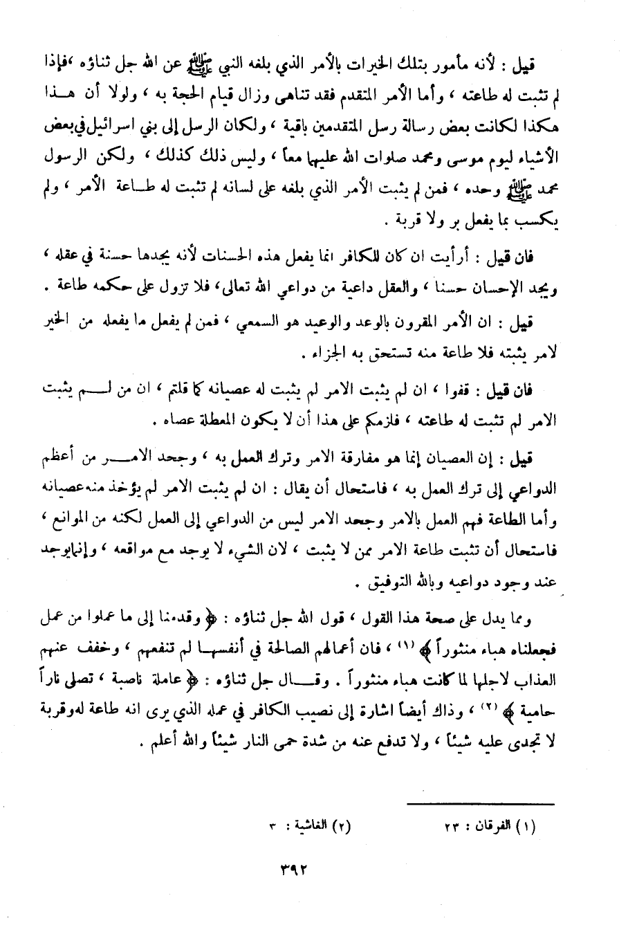 ومما يدل على صحة هذا القول، قول الله جل ثناؤه: {وقدمنا إلى ما عملوا من عمل فجعلناه هباء منثورا}، فإن أعمالهم الصالحة في أنفسها لم تنفعهم، وخفف عنهم العذاب لأجلها لما كانت هباء منثورا. وقال جل ثناؤه: {عاملة ناصبة، تصلى نارا حامية}، وذاك أيضا إشارة إلى نصيب الكافر في عمله الذي يرى أنه طاعة له وقربة لا تجدي عليه شيئا، ولا تدفع عنه من شدة حمى النار شيئا والله أعلم.