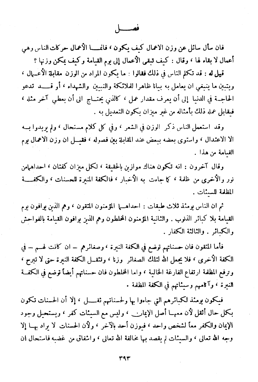 فإن سأل سائل عن وزن الأعمال كيف يكون، فإنما الأعمال حركات الناس وهي أعمال لا بقاء لها، وقال: كيف تبقى الأعمال إلى يوم القيامة وكيف يمكن وزنها؟