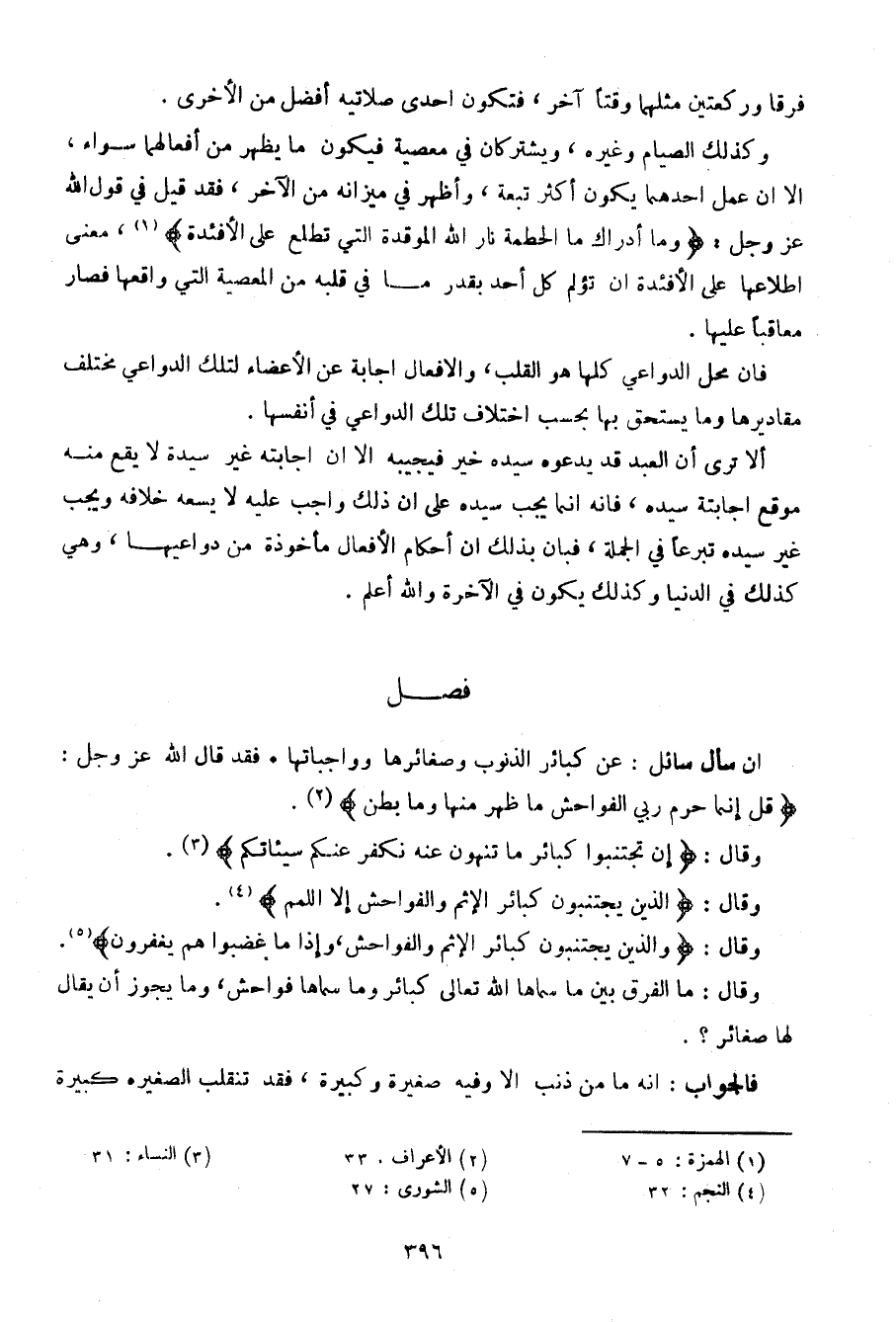وكذلك الصيام وغيره، ويشتركان في معصية فيكون ما يظهر من أفعالهما سواء، إلا أن عمل أحدهما يكزن أكثر تبعة، وأظهر في ميزانه من الآخر، فقد قيل في قول الله عز وجل: {وما أدراك ما الحطمة نار الله الموقدة التي تطلع على الأفئدة}، معنى اطلاعها على الأفئدة أن تؤلم كل أحد بقدر ما في قلبه من المعصية التي واقعها فصار معاقبا عليها.