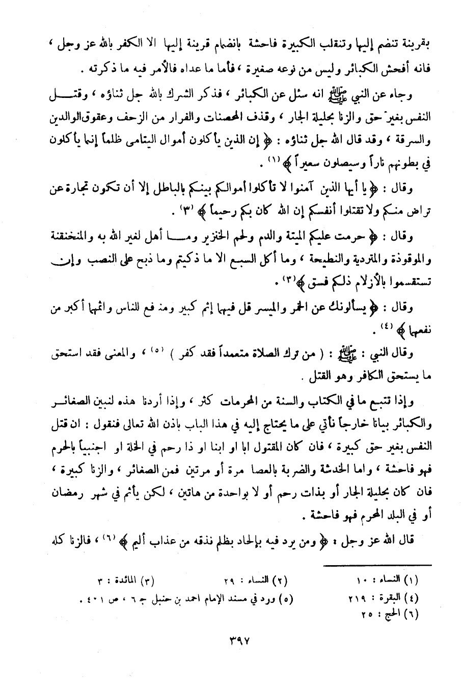 وإذا تتبع ما في الكتاب والسنة من المحرمات كثر، وإذا أردنا هذه لنبين الصغائر والكبائر بيانا خارجا نأتي على ما يحتاج إليه من هذا الباب بإذن الله تعالى فنقول: إن قتل النفس بغير حق كبيرة، فإن كان المقتول أبا أو ابنا أو ذا رحم في الخلة أو أجنبيا بالحرم فهو فاحشة، وأما الخدشة والضربة بالعصا مرة أو مرتين فمن الصغائر، والزنا كبيرة، فإن كان بحليلة الجار أو بذات رحم أو لا بواحدة من هاتين، لكن يأثم في شهر رمضان أو في البلد المحرم فهو فاحشة.