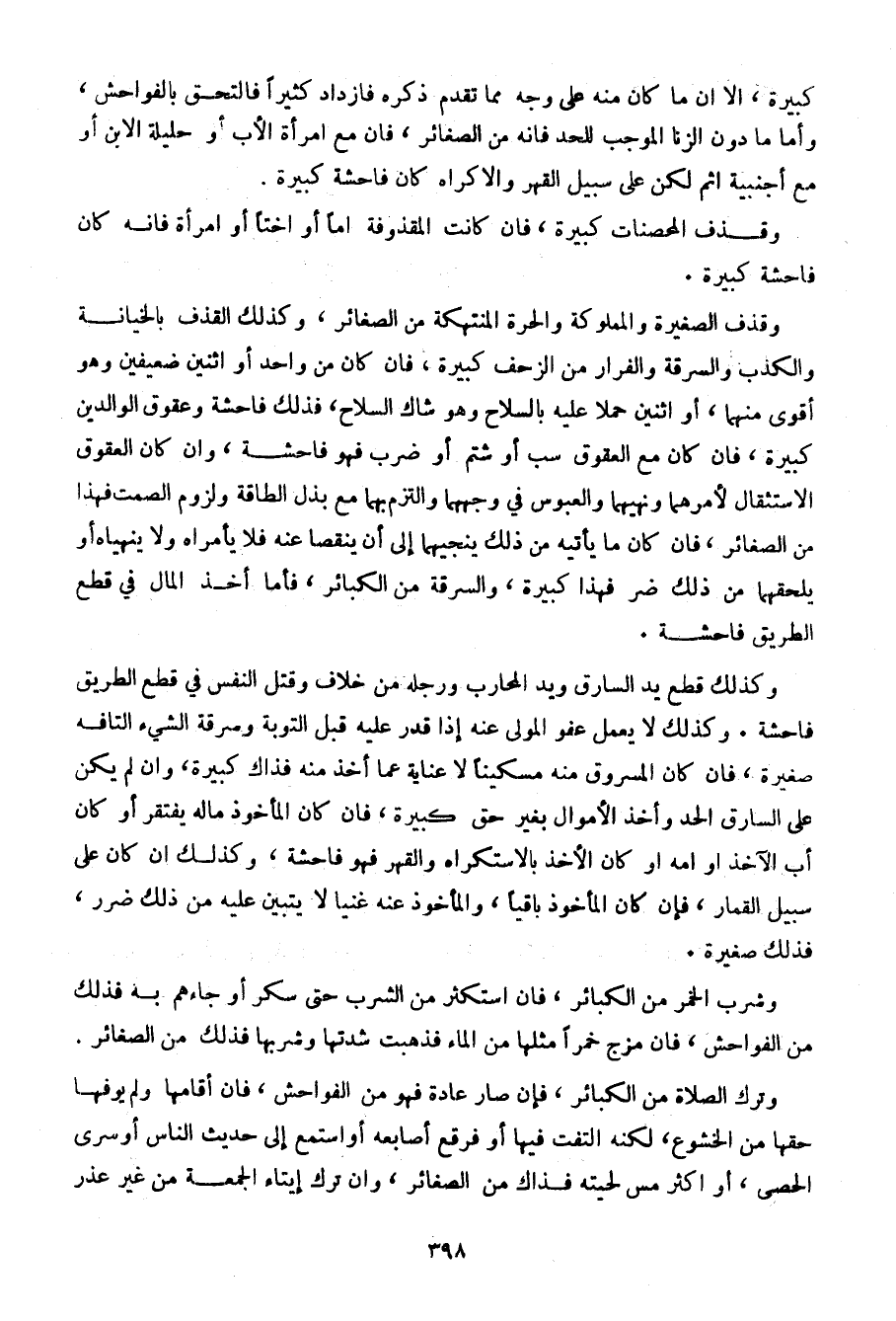 وكذلك قطع يد السارق ويد المحارب ورجله من خلاف وقتل النفس في قطع الطريق فاحشة. وكذلك لا يعمل عفو المولى عنه إذا قدر عليه قبل التوبة وسرقة الشيء التافه صغيرة، فإن كان المسروق منه مسكينا لا عناية عما أخذ منه فذاك كبيرة، وإن لم يكن على السارق الحد وأخذ الأموال بغير حق كبيرة، فإن كان المأخوذ ماله يفتقر أو كان أب الآخذ أو أمه أو كان الأخذ بالاستكراه والقهر فهو فاحشة، وكذلك إن كان على سبيل القمار، فإن كان المأخوذ باقيا، والمأخوذ عنه غنيا لا يتبين عليه من ذلك ضرر، فذلك صغيرة.