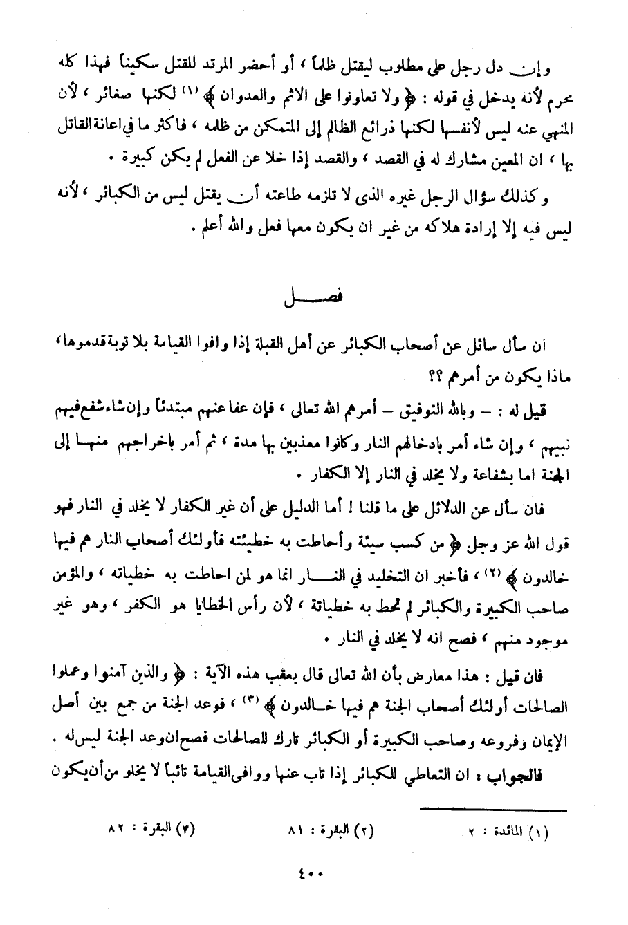 فإن سأل عن الدلائل على ما قلنا! أما الدليل على أن غبر الكفار لا يخلد في النار فهو قول الله عز وجل {من كسب سيئة وأحاطت به خطيئته فأولئك أصحاب النار هم فيها خالدون}، فأخبر أن التخليد في النار إنما هو لمن أحاطت به خطياته، والمؤمن صاحب الكبيرة والكبائر لم تحط به خطياته، لأن رأس الخطايا هو الكفر، وهو غير موجود منهم، فصح أنه لا يخلد في النار.