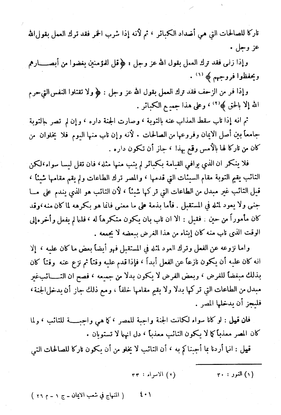 فلا ينكر أن الذي يوافي القيامة بكبائر لم يتب منها مثله، فإن تقل ليسا سواء، لكن التائب يقيم التوبة مقام السيئات التي قدمها، والمصر ترك الطاعات ولم يقم مقامها شيئا، قيل التائب غير مبدل من الطاعات التي تركها شيئا، لأن التائب هو الذي يندم على ما جنى ولا يعود لمثله في المستقبل. فأما بذمة على ما معنى فإنما هو بكرهه لما كان منه، وقد كان مأمورا من حين: فقيل: إلا أن تاب بأن يكون متكرها له، فلما لم يفعل وآخره إلى الوقت الذي تاب منه كان إيتاء من هذا الغرض ببعضه لا يجمعه.