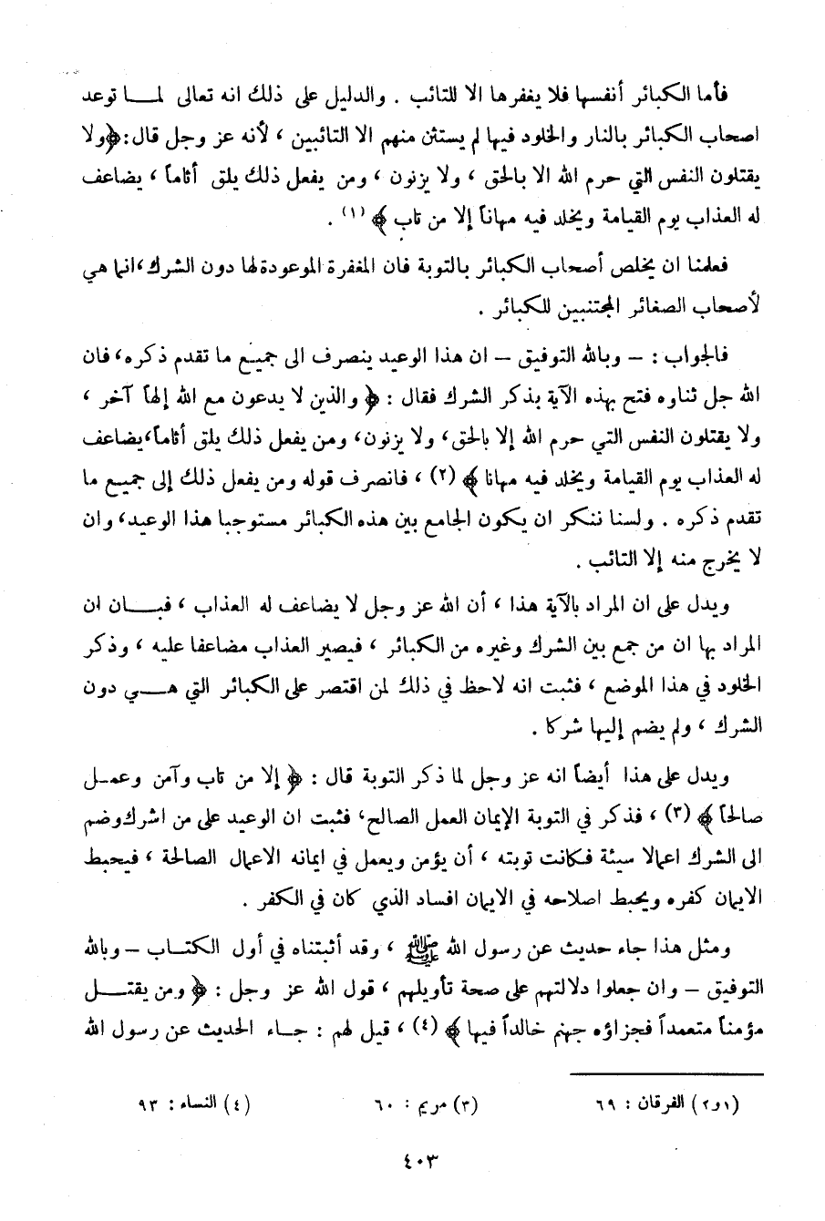 فالجواب: -وبالله التوفيق- أن هذا الوعيد ينصرف إلى جميع ما تقدم ذكره، فإن الله عز وجل ثناؤه فتح بهذه الآية بذكر الشرك فقال: {والذين لا يدعون مع الله إلها آخر، ولا يقتلون النفس التي حرم الله إلا بالحق، ولا يزنون، ومن يفعل ذلك يلق أثاما، يضاعف له العذاب يوم القيامة ويخلد فيه مهانا}، فانصرف قوله ومن يفعل ذلك إلى جميع ما تقدم ذكره. ولسنا ننكر أن يكون الجامع بين هذه الكبائر مستوجبا هذا الوعيد، وأن لا يخرج منه إلا التائب.