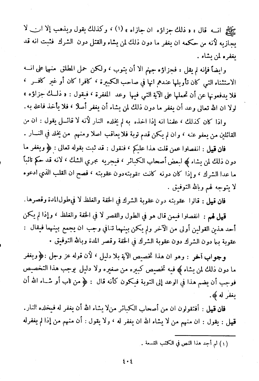 فإن قيل: أفتقولون أن من أصحاب الكبائر من لا يشاء الله أن يغفر له فيخلده النار. قيل: يقول: إن منهم من لا يشاء الله أن يغفر له، ولا يقول: أن منهم من إذا لم يغفر له