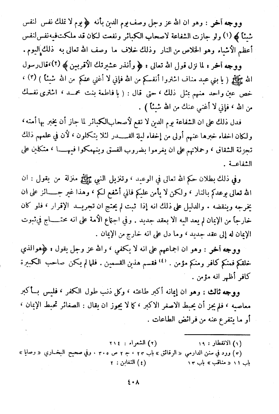 ووجه آخر: وهو أن إجماعهم على أنه لا يكفي، والله عز وجل يقول: {هو الذي خلقكم فمنكم كافر ومنكم مؤمن. فقسم هذي القسمين. فلما لم يكن صاحب الكبيرة كافر أظهر أنه مؤمن.