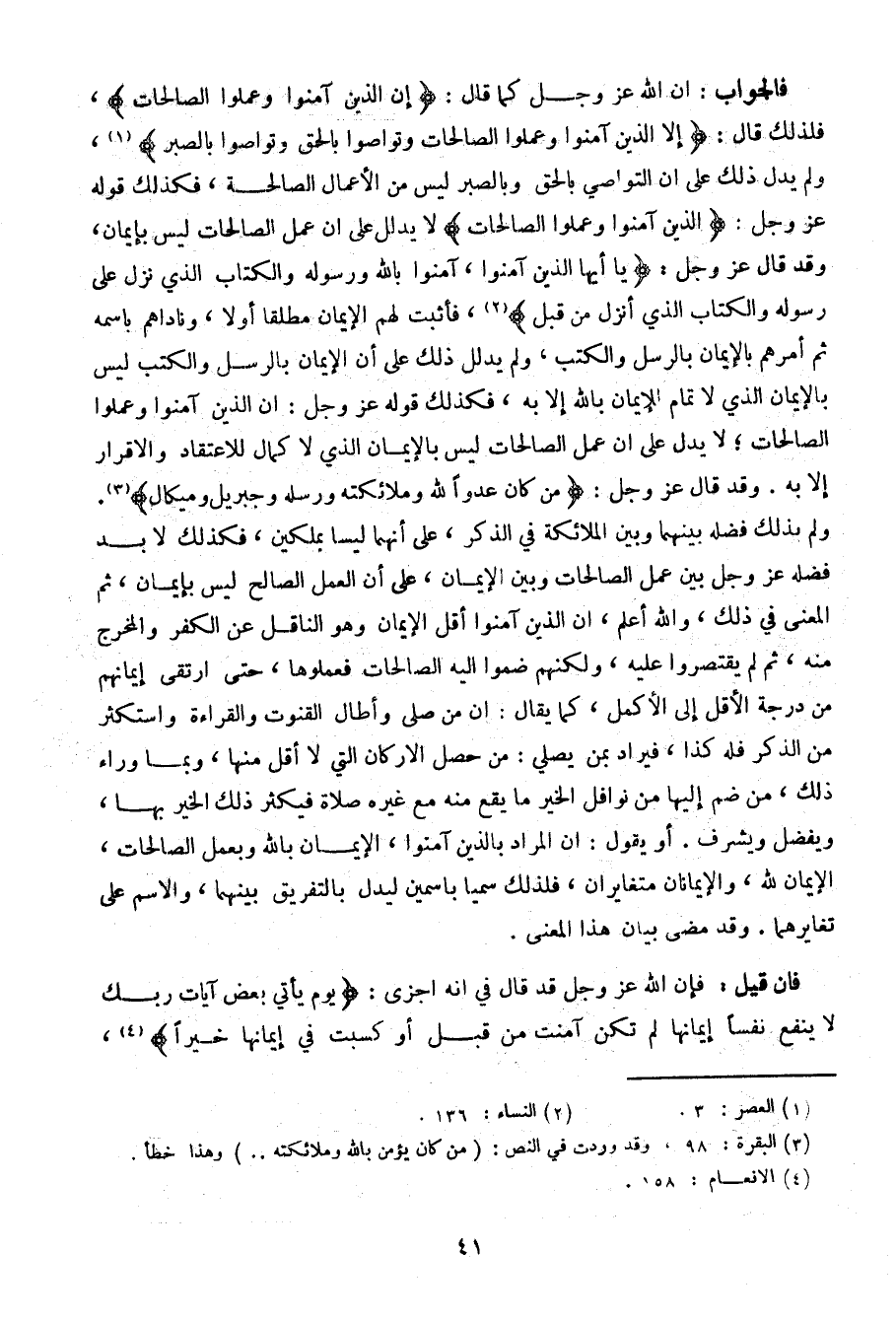 فالجواب: أن الله عز وجل كما قال: {إن الذين آمنوا وعملوا الصالحات}، فلذلك قال: {إلا الذين آمنوا وعملوا الصالحات وتواصوا بالحق وتواصوا بالصبر}، ولم يدل ذلك على أن التواصي بالحق وبالصبر ليس من الأعمال الصالحة، فكذلك قوله عز وجل: {الذين آمنوا وعملوا الصالحات} لا يدلل على أن عمل الصالحات ليس بإيمان، وقد قال عز وجل: {يا أيها الذين آمنوا، آمنوا بالله ورسوله والكتاب الذي نزل على رسوله والكتاب الذي أنزل من قبل}، فأثبت لهم الإيمان مطلقا أولا، وناداهم باسمه ثم أمرهم بالإيمان بالرسل والكتب، ولم يدلل ذلك على أن الإيمان بالرسل والكتب ليس بالإيمان الذي لا تمام للإيمان بالله إلا به، فكذلك قوله عز وجل: إن الذين آمنوا وعملوا الصالحات؛ لا يدل على أن عمل الصالحات ليس بالإيمان الذي لا كمال للاعتقاد والإقرار إلا به. وقد قال عز وجل: {من كان عدوا لله وملائكته ورسله وجبريل وميكال}. ولم بذلك فضله بينهما وبين الملائكة في الذكر، على أنهما ليسا بملكين، فكذلك لابد فضله عز وجل بين عمل الصالحات وبين الإيمان، على أن العمل الصالح ليس بإيمان، ثم المعنى في ذلك، والله أعلم، إن الذين آمنوا أقل الإيمان وهو الناقل عن الكفر والمخرج منه، ثم لم يقتصروا عليه، ولكنهم ضموا إليه الصالحات فعملوها، حتى ارتقى إيمانهم من درجة الأقل إلى الأكمل، كما يقال: أن من صلى وأطال القنوت والقراءة واستكثر من الذكر فله كذا، فيراد بمن يصلي: من حصل الأركان التي لا أقل منها، وبما وراء ذلك، من ضم إليها من نوافل الخير ما يقع منه مع غيره صلاة فيكثر ذلك الخير بها، ويفضل ويشرف. أو يقول: أن المراد بالذين آمنوا، الإيمان بالله وبعمل الصالحات، الإيمان لله، والإيمانان متغايران، فلذلك سميا باسمين ليدل بالتفريق بينهما، والاسم على تغايرهما. وقد مضى بيان هذا المعنى.