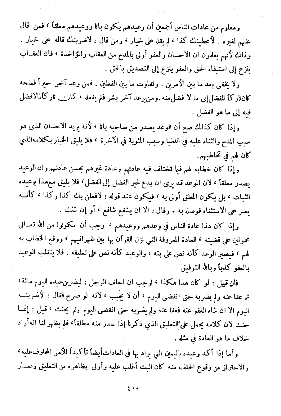 ومعلوم من عادات الناس أجمعين أن وعيدهم يكون باتا ووعيدهم معلقا، فمن قال عنهم لغيره: لأعطينك كذا، لم يقله على خيار، ومن قال: لاضربنك قاله على خيار. وذلك لأنهم يعلمون أن الإحسان والعفو أولى بالمدح من العقاب والمؤاخذة، فإن العقاب ينزع إلى استيفاء الحق والعفو ينزع إلى التصديق بالحق.