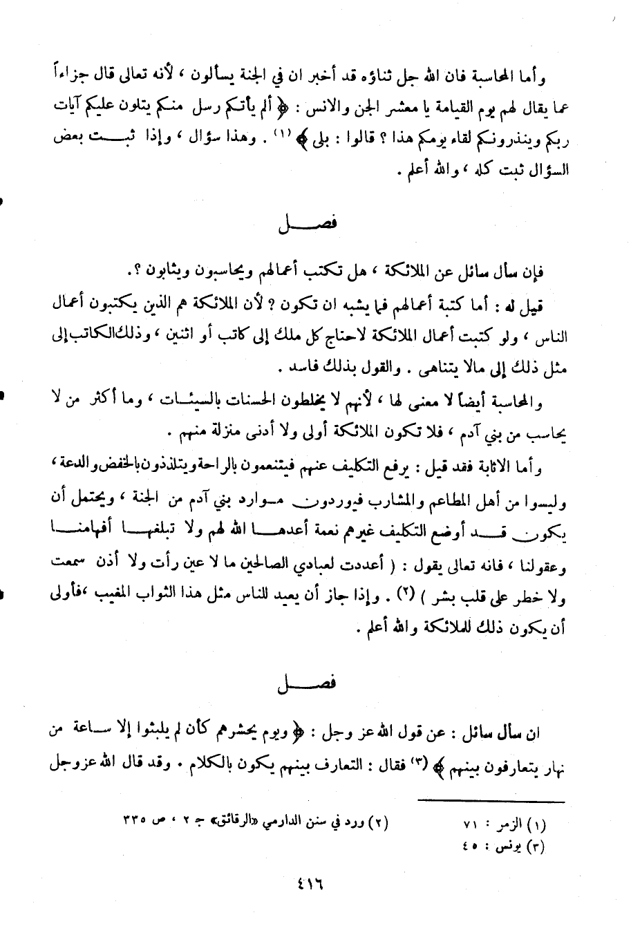 وأما المحاسبة فإن الله جل ثناؤه قد أخبر أن في الجنة يسألون، لأنه تعالى قال جزاءا عما يقال لهم يوم القيامة يا معشر الجن والإنس: {ألم يأتكم رسل منكم يتلون عليكم آيات ربكم وينذرونكم لقاء يومكم هذا؟ قالوا: بلى}. وهذا سؤال، وإذا ثبت بعض السؤال ثبت كله، والله أعلم.