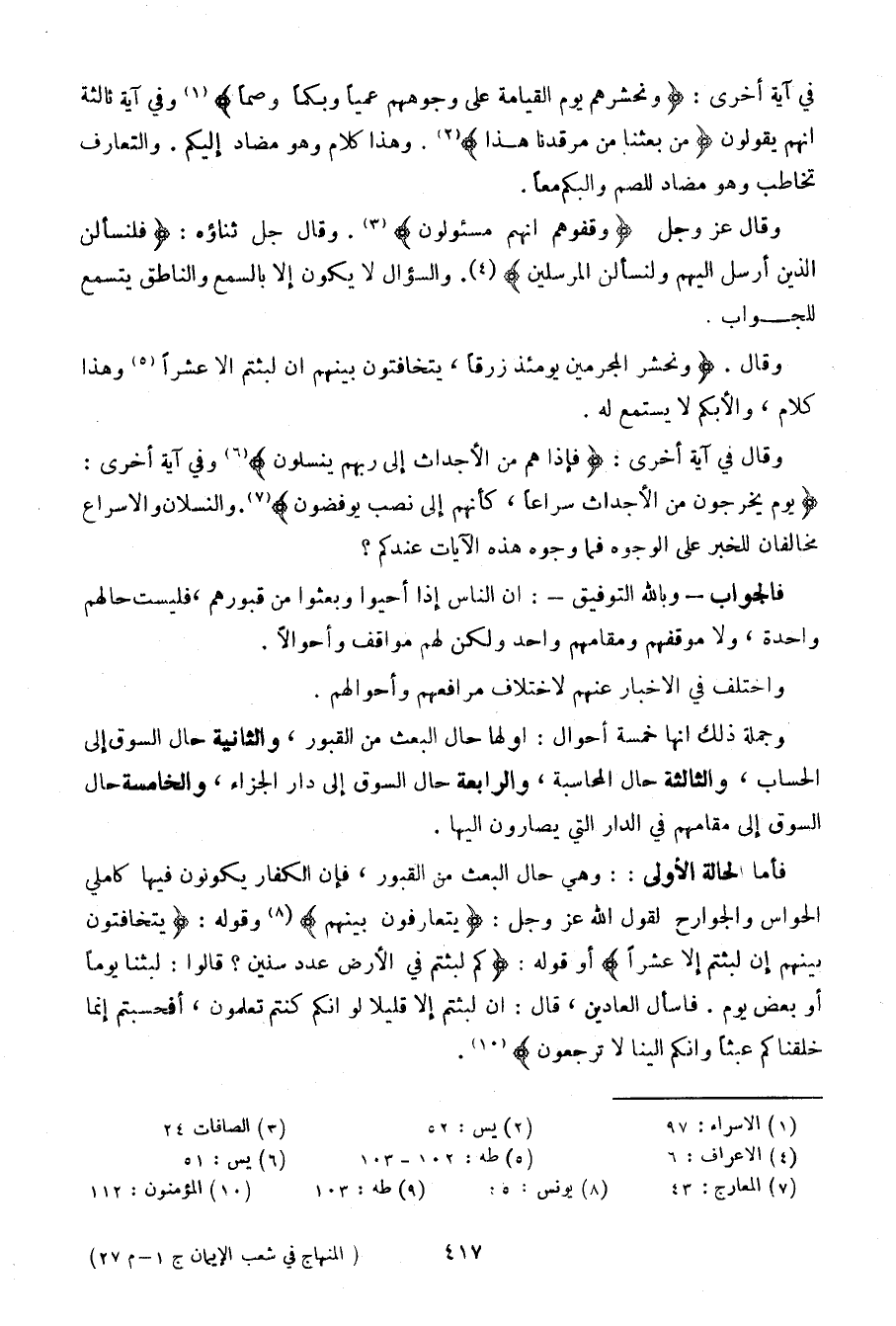 وجملة ذلك أنها خمسة أحوال: أولها حال البعث من القبور، والثانية حال السوق إلى الحساب، والثالثة حال المحاسبة، والرابعة حال السوق إلى دار الجزاء، والخامسة حال السوق إلى مقامهم في الدار التي يصارون إليها.