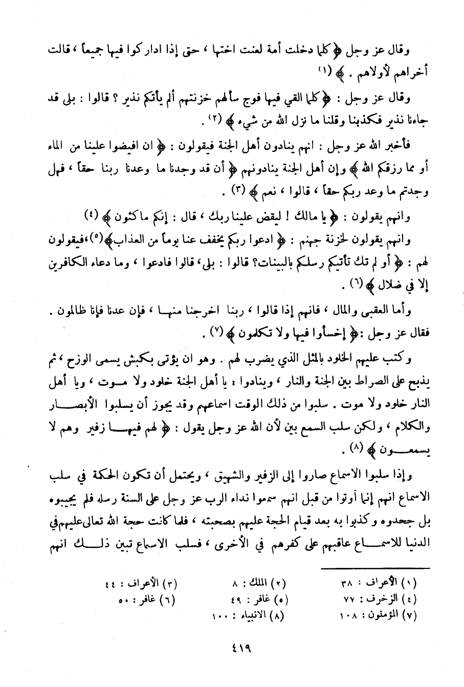 فأخبر الله عز وجل: أنهم ينادون أهل الجنة فيقولون: {أن أفيضوا علينا من الماء أو مما رزقكم الله} وإن أهل الجنة ينادونهم {أن قد وجدنا ما وعدنا ربنا حقا، فهل وجدتم ما وعد ربكم حقا، قالوا، نعم}.