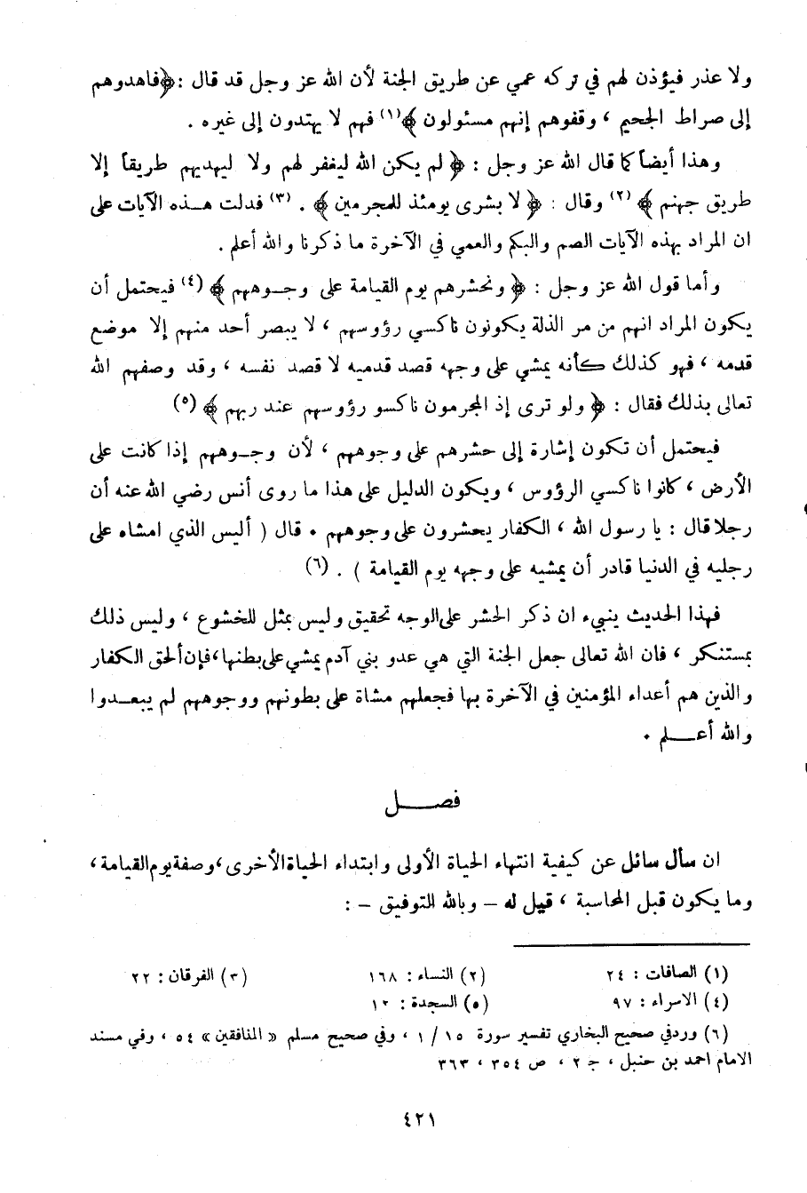 إن سأل سائل عن كيفية انتهاء الحياة الأولى وابتداء الحياة الأخرى، وصفة يوم القيامة، وما يكون قبل المحاسبة، قيل له- وبالله التوفيق-: