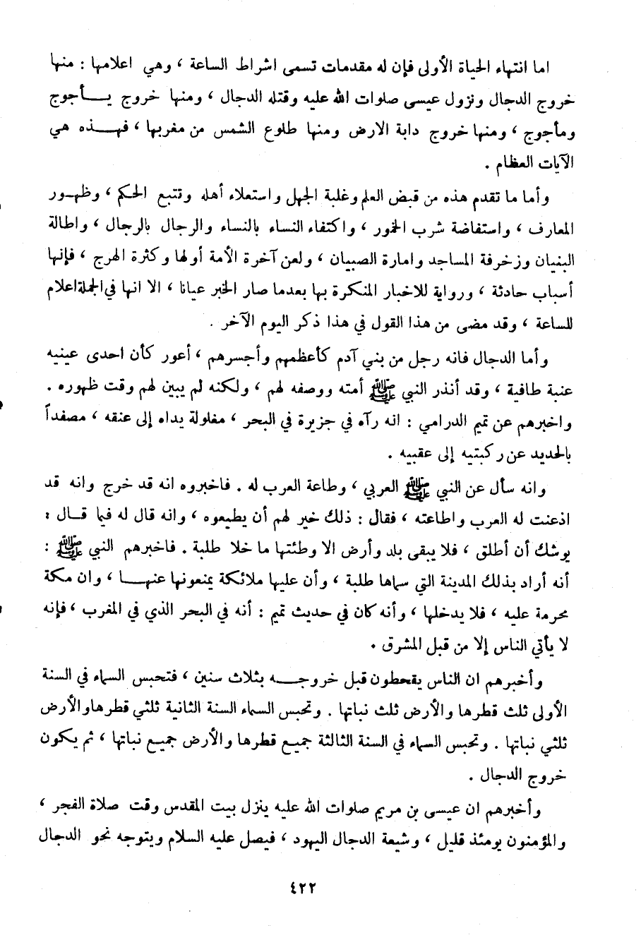 وأما الدجال فإنه رجل من بني آدم كأعظمهم وأجسرهم، أعور كأن إحدى عينيه عنبة طافية، وقد أنذر النبي صلى الله عليه وسلم أمته ووصفه لهم، ولكنه لم يبين لهم وقت ظهوره. وأخبرهم عن تميم الدرامي: أنه رآه في جزيرة في البحر، مغلولة يداه إلى عنقه، مصفدا بالحديد عن ركبتيه إلى عقبيه.