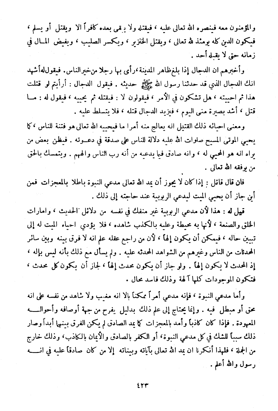 وأما مدعي النبوة، فإنه مدعي أمرا ممكنا بالا أنه مغيب ولا شاهد من نفسه على أنه محق أو مبطل فيه. وإنما يحتاج إلى علم ذلك بدليل يفرح من جهة أوصافه وأحواله المعهودة. فإذا كان كاذبا وأمد بالمعجزات كما يمد الصادق لم يكن الفرق بينهما أبدا وصار ذلك سببا للشك في كل مدعي النبوة، أو الكفر بالصادق والإيمان بالكاذب، وذلك خارج من الجملة، فلهذا أنكرنا أن يمد الله تعالى بآياته وبيناته إلا من كان صادقا عليه في أنه رسول والله أعلم.