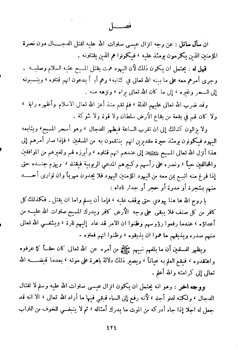إن سأل سائل: عن وجه إنزال عيسى صلوات الله عليه لقتل الدجال دون نصرة المؤمنين الذين يكرمون يومئذ عليه، فيكونوا هم الذين يقتلونه.