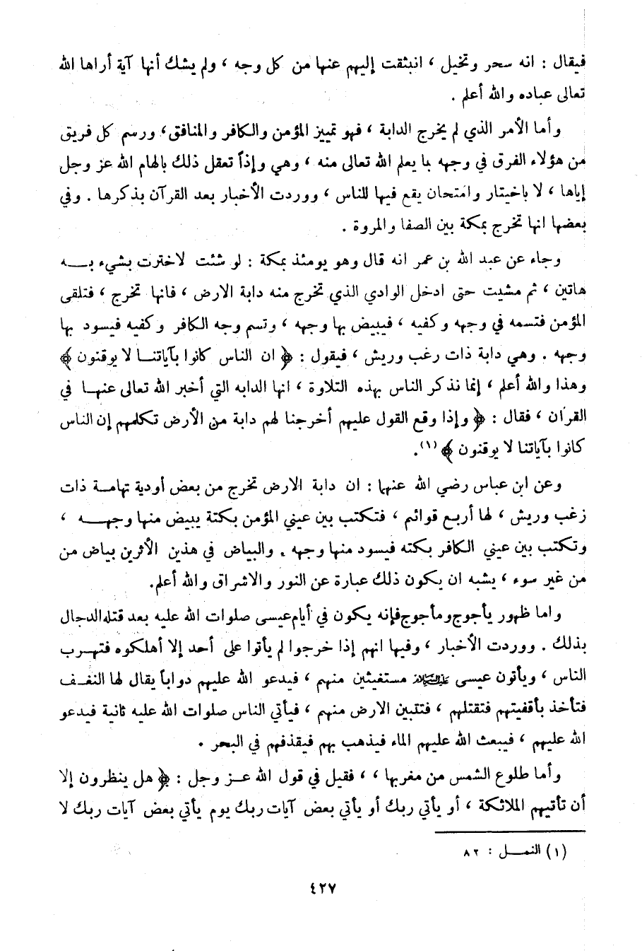 وجاء عن عبد الله بن عمر أنه قال وهو يومئذ بمكة: لو شئت لاخترت بشيء به هاتين، ثم مشيت حتى أدخل الوادي الذي تخرج منه دابة الأرض، فإنما تخرج، فتلقى المؤمن فتسمه في وجهه وكفيه، فيبيض بها وجهه، وتسم وجه الكافر وكفيه فيسود بها وجهه. وهي دابة ذات رغب وريش، فيقول: {إن الناس كانوا بآياتنا لا يوقنون} وهذا والله أعلم، إنما نذكر الناس بهذه التلاوة، إنها الدابة التي أخبر الله تعالى عنها في القرآن، فقال: {وإذا وقع القول عليهم أخرجنا لهم دابة من الأرض تكلمهم إن الناس كانوا بآياتنا لا يوقنون}.