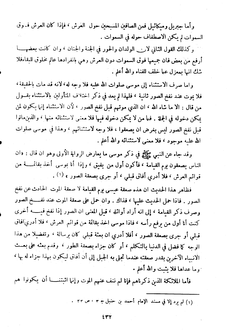 وأما صرف الاستثناء إلى موسى صلوات الله عليه فلا وجه له، لأنه قد مات بالحقيقة، فلا يموت عند نفخ الصور ثانية، فلهذا لم يعد في ذكر اختلاف المتأولين بالاستثناء بقول من قال: إلا ما شاء الله، أن الذي موتهم قبل نفخ الصور، لأن الاستثناء غنما يكون لمن يمكن دخوله في الجملة. فما من لا يمكن دخوله فيها فلا معنى لاستثنائه منها، والذين ماتوا قبل نفخ الصور ليس بغرض أن يصعقوا، فلا وجه لاستثنائهم، وهذا في موسى صلوات الله عليه موجود، فلا معنى لاستثنائه والله أعلم.