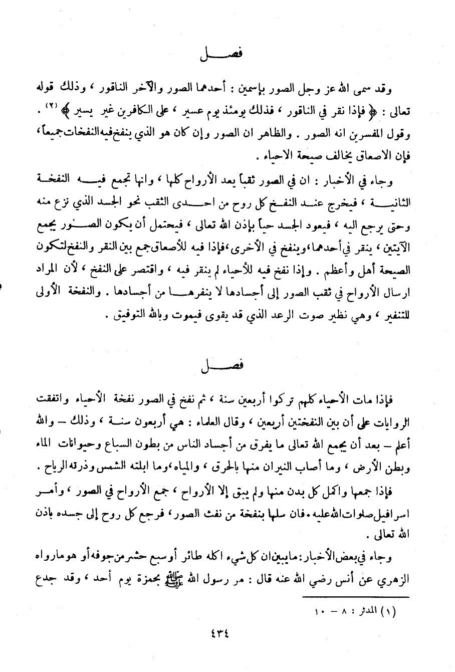 فإذا جمعها وأكمل كل بدن منها ولم يبق إلا الأرواح، جمع الأرواح في الصور، وأمر إسرافيل صلوات الله عليه. فإن سلها بنفخة من نفث الصور، فرجع كل روح إلى جسده بإذن الله تعالى.