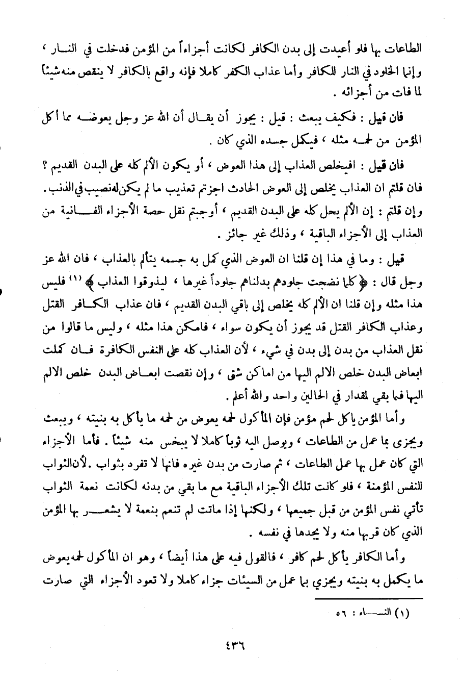 قيل: وما في هذا إن قلنا إن العوض الذي كمل به جسمه يتألم بالعذاب، فإن الله عز وجل قال: {كلما نضجت جلودهم بدلناهم جلودا غيرها، ليذوقوا العذاب} فليس هذا مثله وإن قلنا أن الألم كله يخلص إلى باقي البدن القديم، فإن عذاب الكافر القتل وعذاب الكافر القتل قد يجوز أن يكون سواء، فأمكن هذا مثله، وليس ما قالوا من نقل العذاب من بدن إلى بدن في شيء، لأن العذاب كله على النفس الكافرة فإن كملت أبعاض البدن خلص الألم إليها من أماكن شتى، وإن نقصت أبعاض البدن خلص الألم إليها فيما بقى لمقدار في الحالين واحد والله أعلم.