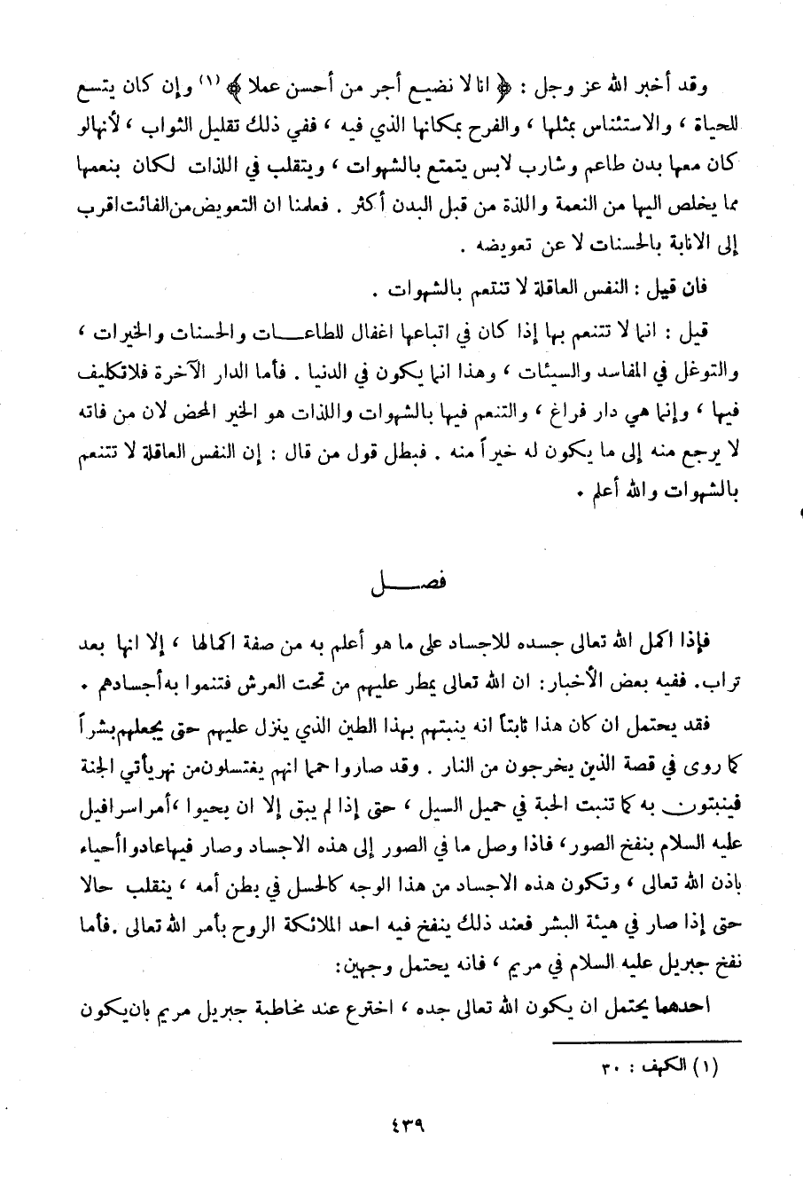 قيل: إنما لا تتنعم بها إذا كان في أتباعها إغفال للطاعات والحسنات والخيرات، والتوغل في المفاسد والسيئات، وهذا إنما يكون في الدنيا. فأما الدار الآخرة فلا تكليف فيها، وإنما هي دار فراغ، والتنعم فيها بالشهوات واللذات هو الخير المحض لن من فاته لا يرجع منه إلى ما يكون له خيرا منه. فبطل قول من قال: إن النفس العاقلة لا تتنعم بالشهوات والله أعلم.