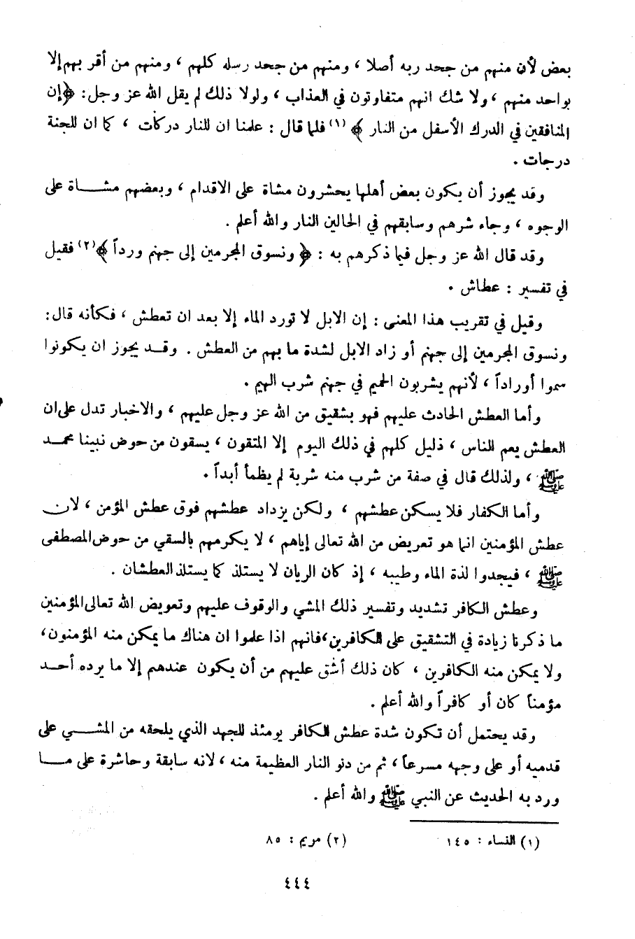 وعطش الكافر تشديد وتفسير ذلك المشي والوقوف عليهم وتعويض الله تعالى المؤمنين ما ذكرنا زيادة في التشقيق على الكافرين، فإنهم إذا علموا أن هناك ما يمكن منه المؤمنون، ولا يمكن منه الكافرين، كان ذلك أشق عليهم من أن يكون عندهم إلا ما يرده أحد مؤمنا كان أو كافرا والله أعلم.