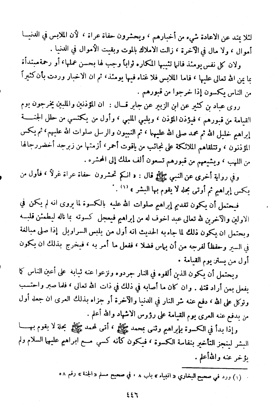 وفي رواية أخرى عن النبي صلى الله عليه وسلم قال: "إنكم تحشرون حفاة عراة غرلا، فأول من يكس إبراهيم ثم أوتى بحلة لا يقوم بها البشر".