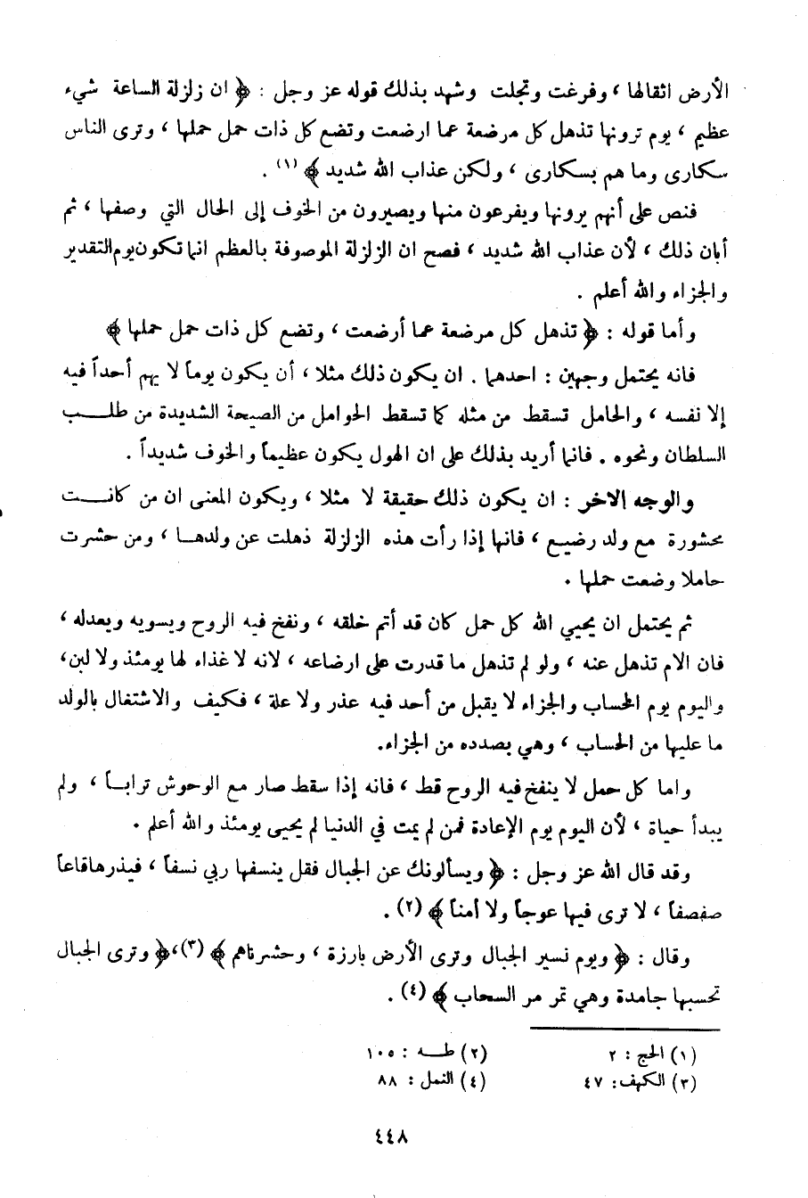 ثم يحتمل أن يحيي الله كل حمل كان قد أتم خلقه، ونفخ فيه الروح ويسويه ويعدله، فإن الأم تذهل عنه، ولو لم تذهل ما قدرت على إرضاعه، لأنه لا غذاء لها يومئذ ولا لبن، واليوم يوم الحساب والجزاء لا يقبل من أحد فيه عذر ولا علة، فكيف والاشتغال بالولد ما عليها من الحساب، وهي بصدده من الجزاء.