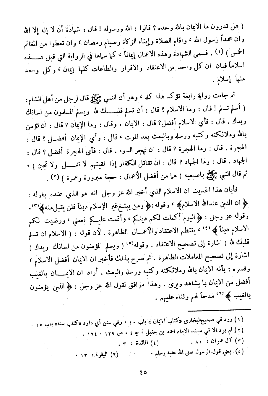 (هل تدرون ما الإيمان بالله وحده؟ قالوا: الله ورسوله! قال: شهادة أن لا إله إلا الله وأن محمدا رسول الله، وإقام الصلاة وإيتاء الزكاة وصيام رمضان، وأن تعطوا من المغانم الخمس). فسمى الشهادة وهذه الأعمال إيمانا، كما سماها في الرواية التي قبل هذه إسلاما فبان أن كل واحد من الاعتقاد والإقرار والطاعات كلها إيمان، وكل واحد منها إسلام.