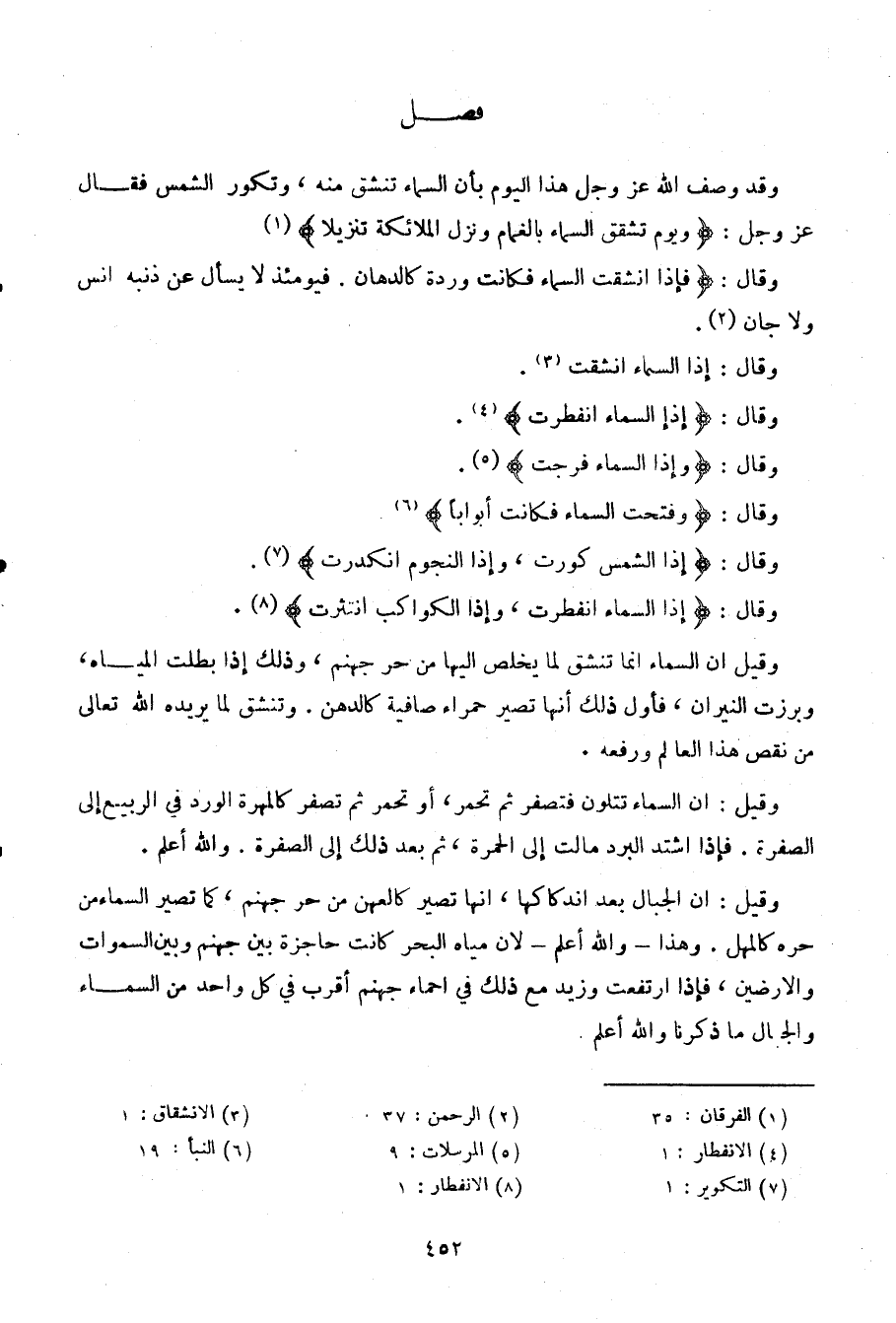 وقد وصف الله عز وجل هذا اليوم بأن السماء تنشف منه، وتكور الشمس فقال عز وجل: {ويوم تشقق السماء بالغمام ونزل الملائكة تنزيلا}.