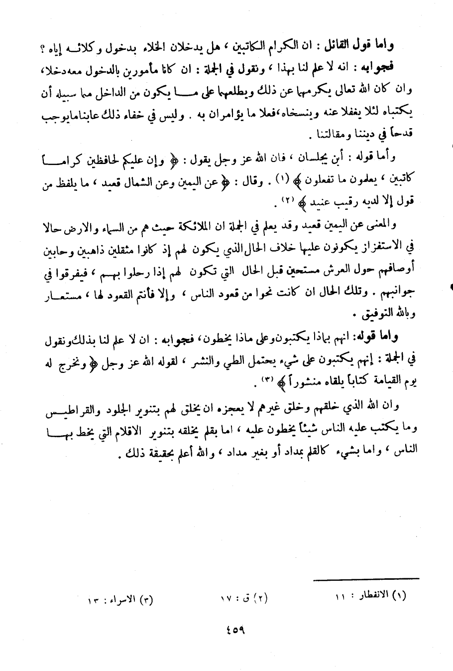 وأما قول القائل: أن الكرام الكاتبين، هل يدخلان الخلاء بدخول وكلائه إياه؟