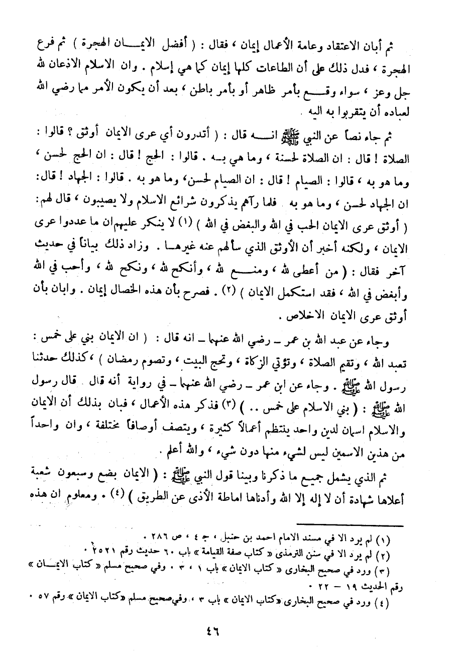 ثم أبان الاعتقاد وعامة الأعمال إيمان، فقال: (أفضل الإيمان الهجرة) ثم فرع الهجرة، فدل ذلك على أن الطاعات كلها إيمان كما هي إسلام، وأن الإسلام الإذعان لله جل وعز، سواء وقع بأمر ظاهر أو بأمر باطن، بعد أن يكون الأمر مما رضي الله لعباده أن يتقربوا به إليه.