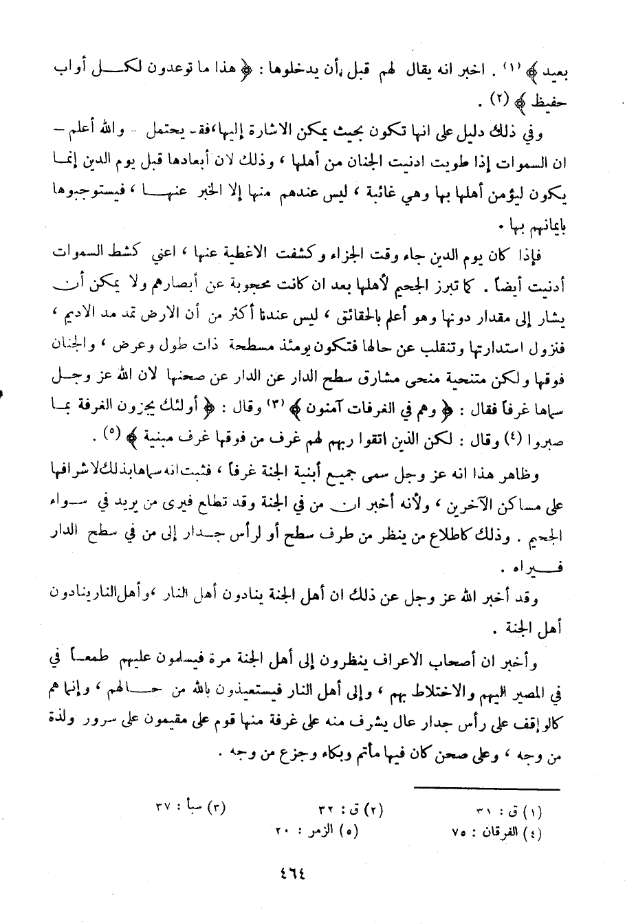 فإذا كان يوم الدين جاء وقت الجزاء وكشفت الأعطية عنها، أعني كشط السموات أدنيت أيضا. كما تبرز الجحيم لأهلها بعد أن كانت محجوبة عن أبصارهم ولا يمكن أن يشار إلى مقدار دونها وهو أعلم بالحقائق، ليس عندنا أكثر من أن الأرض تمد مد الأديم، فنزول استدارتها وتنقلب عن حالها فتكون يومئذ مسطحة ذات طول وعرض، والجنان فوقها ولكن متنحية منحى مشارق سطح الدار عن الدار عن صحنها لأن الله عز وجل سماها غرفا فقال: {وهم في الغرفات آمنون} وقال: {أولئك يجزون الغرفة بما صبروا وقال: لكن الذين اتقوا ربهم لهم غرف من فوقها غرف مبنية}.