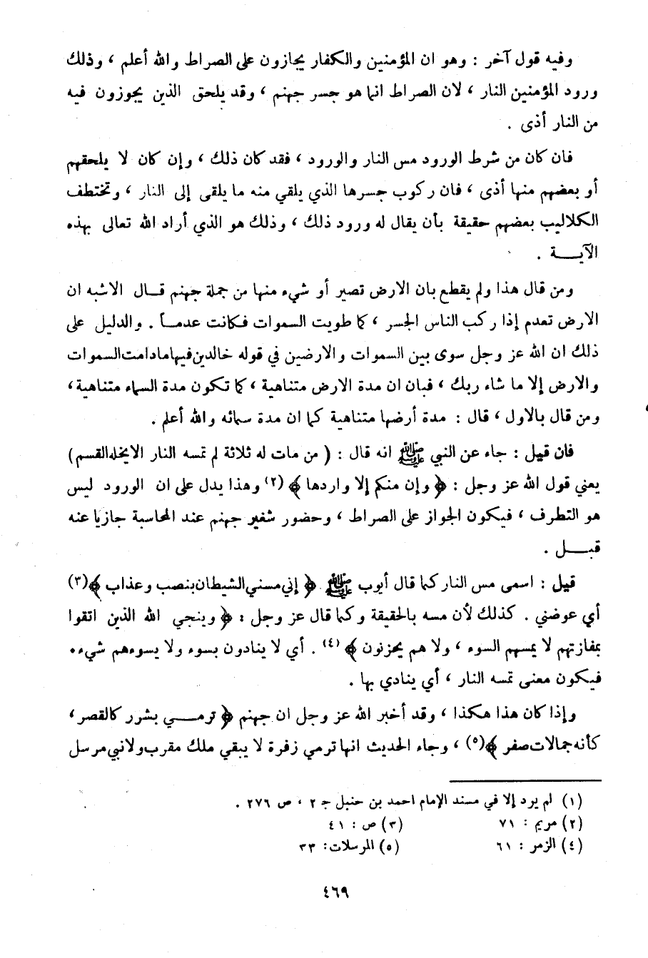 ومن قال هذا ولم يقطع بأن الأرض قصير أو شيء منها من جملة جهنم قال الأشبه أن الأرض تعدم إذا ركب الناس الجسر، ما طويت لسموات فكانت عدما. والدليل على ذلك أن الله عز وجل سوى بين السموات والأرضين في قوله خالدين فيها ما دامت السموات والأرض إلا ما شاء ربك، فبان أن مدة الأرض متناهية، كما تكون مدة السماء متناهية، ومن قال بالأول، قال: مدى أرضها متناهية كما أن مدة سمائه والله أعلم.