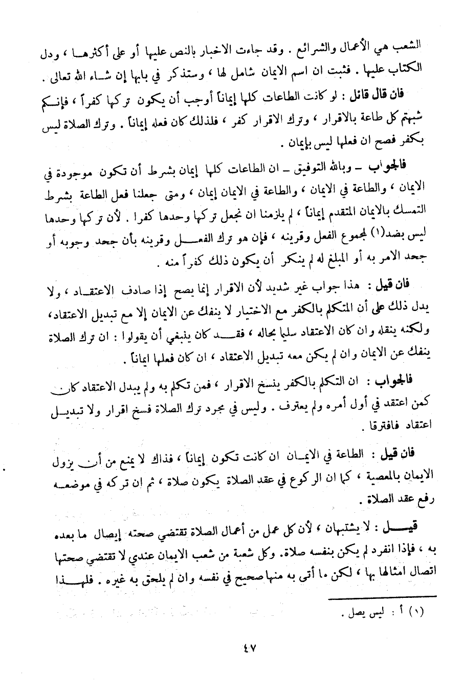 فالجواب- وبالله التوفيق- أن الطاعات كلها إيمان بشرط أن تكون موجودة في الإيمان، والطاعة في الإيمان، والطاعة في الإيمان إيمان، ومتى جعلنا فعل الطاعة بشرط التمسك بالإيمان المتقدم إيمانا، لم يلزمنا أن نجعل تركها وحدها كفرا. لأن تركها وحدها ليس بضد لمجموع الفعل وقرينه، فإن هو ترك الفعل وقرينه بأن جحد وجوبه أو جحد الأمر به أو المبلغ له لم ينكر أن يكون ذلك كفرا منه.