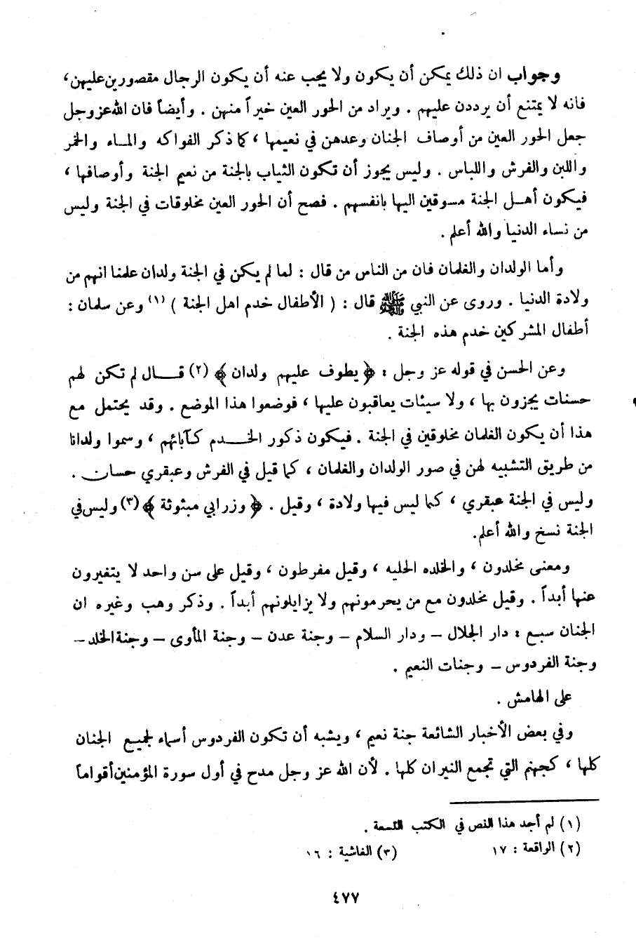 وجواب أن ذلك يمكن أن يكون ولا يجب عنه أن يكون الرجال مقصورين عليهن، فإنه لا يمنع أن يرددن عليهم. ويراد من الحور العين خيرا منهن، وأيضا فإن الله عز وجل جعل الحور العين من أوصاف الجنان وعدهن في نعيمها، كما ذكر الفواكه والماء والخمر واللبن والفرش واللباس. وليس يجوز أن تكون الثياب بالجنة من نعيم الجنة وأوصافها، فيكو أهل الجنة مسوقين إليها بأنفسهم. فصح أن الحور العين مخلوقات في الجنة وليس من نساء الدنيا والله أعلم.