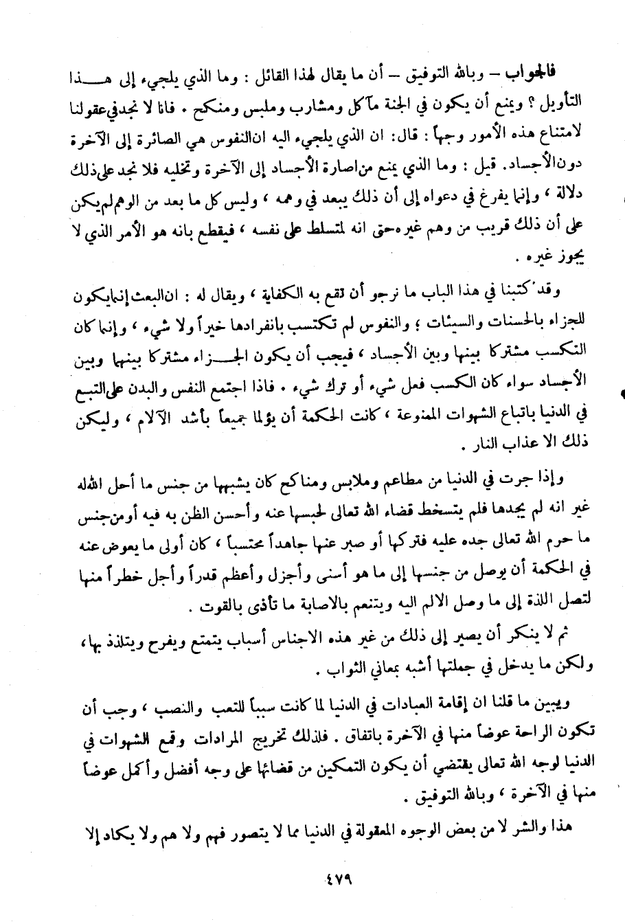وقد كتبنا في هذا الباب ما نرجو أن تقع به الكفاية، ويقال هل: أن البعث إنما يكون للجزاء بالحسنات والسيئات؛ والنفوس لم تكتسب بانفرادها خيرا ولا شيء، وإنما كان التكسب مشتركا بينها وبين الأجساد، فيجب أن يكون الجزاء مشتركا بينهما وبين الأجساد سواء كان الكسب فعل شيء أو ترك شيء. فإذا اجتمع النفس والبدن على التبع في الدنيا بإتباع الشهوات الممنوعة، فكانت الحكمة أن يؤلما جميعا بأشد الآلام، وليكن ذلك إلا عذاب النار.