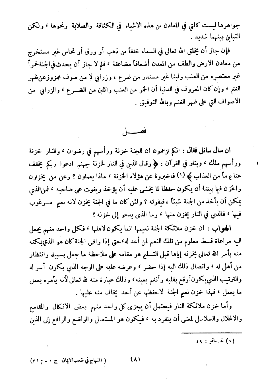 إن سأل سائل فقال: إنكم تزعمون أن للجنة خزنة ورأسهم في رضوان، وللنار خزنة ورأسهم ملك، ويتلو في القرآن: {وقال الذين في النار لخزنة جهنم ادعوا ربكم يخفف عنا يوما من العذاب} فأخبرونا عن هؤلاء الخزنة، ماذا يفعلون؟ وعن من يخزنون والخزن فيما بيننا أن يكون حفظا لما يخشى عليه أن يؤخذ ويفوت على صاحبه، فمن الذي يمكن أن يأخذ من الجنة شيئا، فيفوته؟ ولئن كان ما في الجنة يخزن لأنه نعيم مرغوب فيها، فالذي في النار يخزن منها، وما الذي يدعو إلى خزنه؟