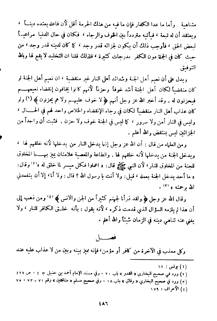 ويدل على أن نعيم أهل الجنة وشدائد أهل النار غير منقضية، أن نعيم أهل الجنة لو كان منقضيا لكان أهل الجنة أشد خوفا وحزنا لأنهم كانوا يخافون انقضاء نعيمهم فيحزنون له. وقد أخبر الله عز وجل أنهم {لا خوف عليهم ولا هم يحزنون} ولو كان عذاب أهل النار منقضيا لكان في رجاء الانقضاء والخلاص واحد لهم في الحال، وليس في النار أمن ولا سرور، كما ليس في الجنة خوف ولا حزن. فثبت أن واحدا من الجزائين ليس بمنتقض والله أعلم.