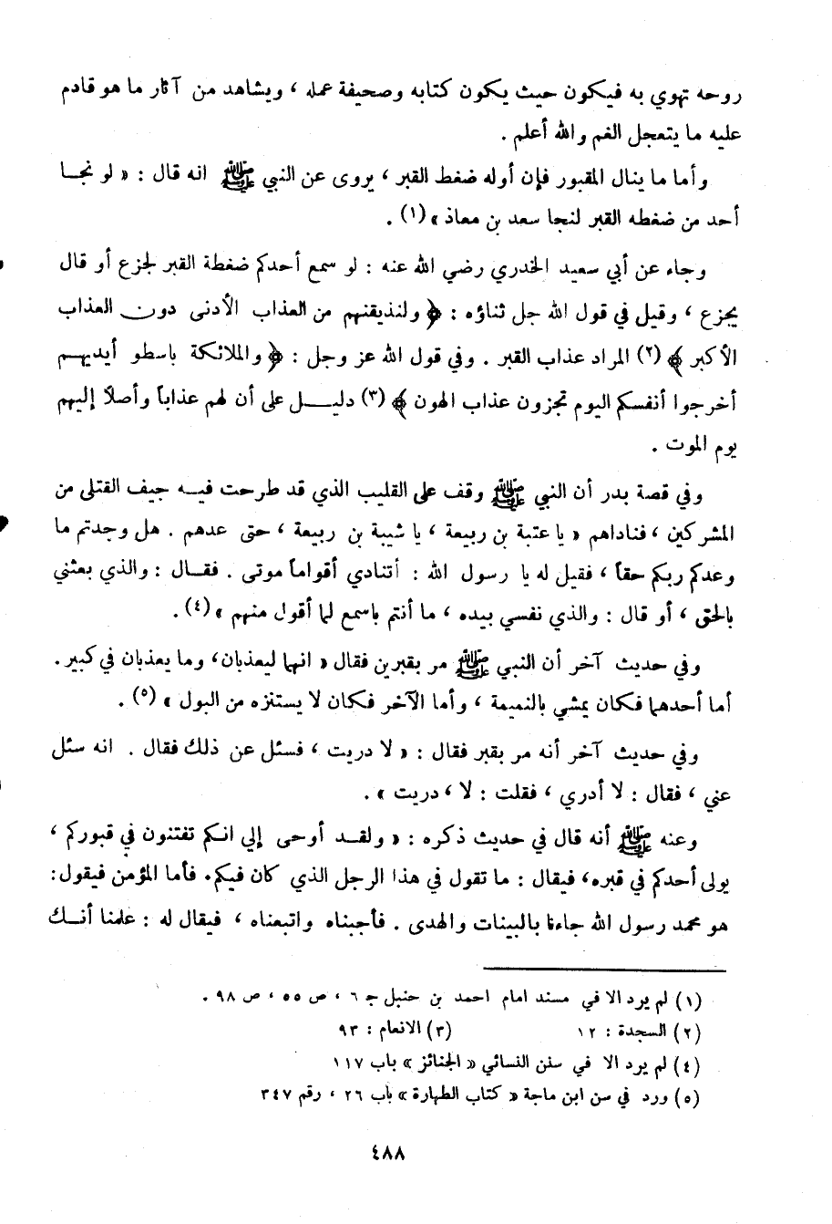 وفي قصة بدر أن النبي صلى الله عليه وسلم وقف على القليب الذي قد طرحت فيه جيف القتلى من المشركين، فناداهم "يا عتبة بن ربيعة، يا شيبة بن ربيعة، حتى عده. هل وجدتم ما وعدكم ربكم حضا، فقيل له يا رسول الله: أتنادي أقواما موتى. فقال: والذي بعثني بالحق، أو قال: والذي نفسي بيده، ما أنتم بأسمع لما أقول منهم".