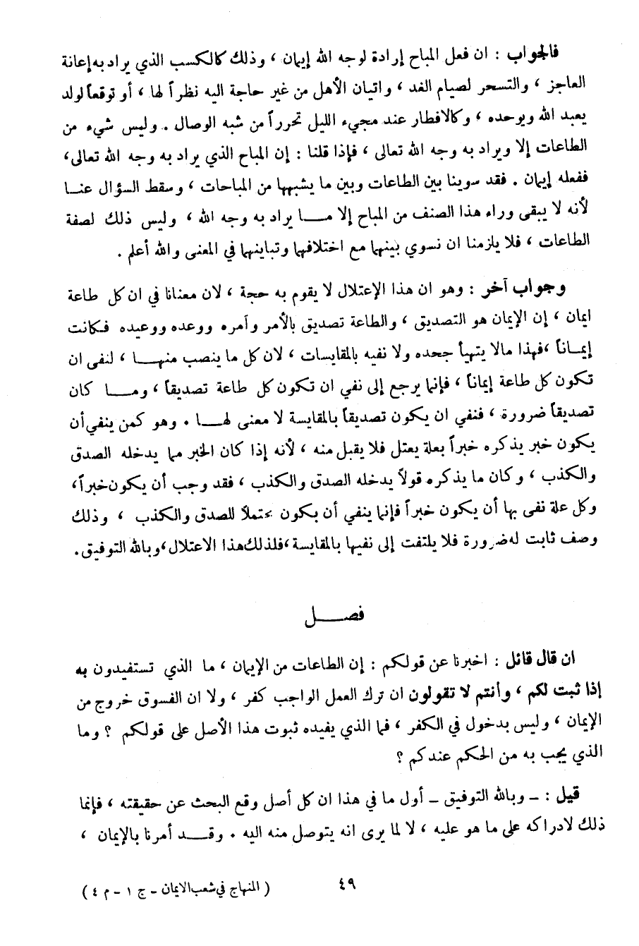 فالجواب: أن فعل المباح إرادة لوجه الله إيمان، وذلك كالكسب الذي يراد به إعانة العاجز، والتسحر لصيام الغد، وإتيان الأهل من غير حاجة إليه نظرا لها، أو توقعا لولد يعبد الله ويوحده، وكالإفطار عند مجيء الليل تحررا من شبه الوصال. وليس شيء من الطاعات إلا ويراد به وجه الله تعالى، فإذا قلنا: إن المباح الذي يراد به وجه الله تعالى، ففعله إيمان. فقد سوينا بين الطاعات وبين ما يشبهها من المباحات، وسقط السؤال عنا لأنه لا يبقى وراء هذا الصنف من المباح إلا ما يراد به وجه الله، وليس ذلك لصفة الطاعات، فلا يلزمنا أن نسوي بينهما مع اختلافهما وتباينهما في المعنى والله أعلم.