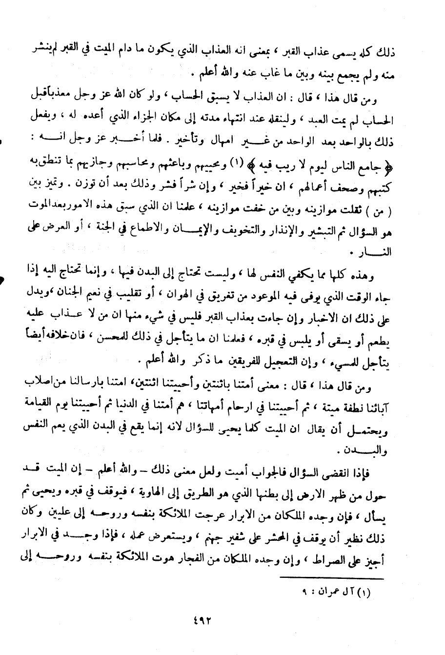 وهذه كلها مما يكفي النفس لها، وليست تحتاج إلى البدن فيها، وإنما تحتاج إليه إذا جاء الوقت الذي يوفى فيه الموعود من تغريق في الهوان، أو تقليب في نعيم الجنان، ويدل على ذلك أن الأخبار وإن جاءت بعذاب القبر فليس في شيء منها إن من لا عذاب عليه يطعم أو يسقى أو يلبس في قبره، فعلمنا أن ما تأجل في ذلك للمحسن، فإن خلافه أيضاً يتأجل للمسيء، وإن التعجيل للفريقين ما ذكر والله أعلم.