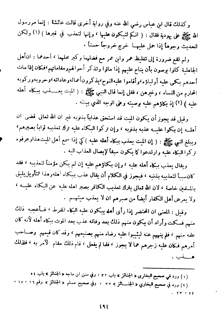 ولم تقع ضرورة إلى تغليط عمر وابن عمر مع فضلهما وكبر محلهما، أحدهما: أن أهل الجاهلية كانوا يوصون بأن يناح عليهم إذا ماتوا وتذكر أحوالهم ومقاماتهم، فكان إذا مات أحدهم بكى عليه أولياؤه، وأقاموا عليه النوح، يذكرون أعماله وعاداته، وحروبه وركوبه المحارم من النساء، وغيرهن، فقل إنما قال النبي صلى الله عليه وسلم: (الميت يعذب ببكاء أهله عليه) إذ بكاؤهم عليه بوصيته وعلى الوجه الذي بينته.