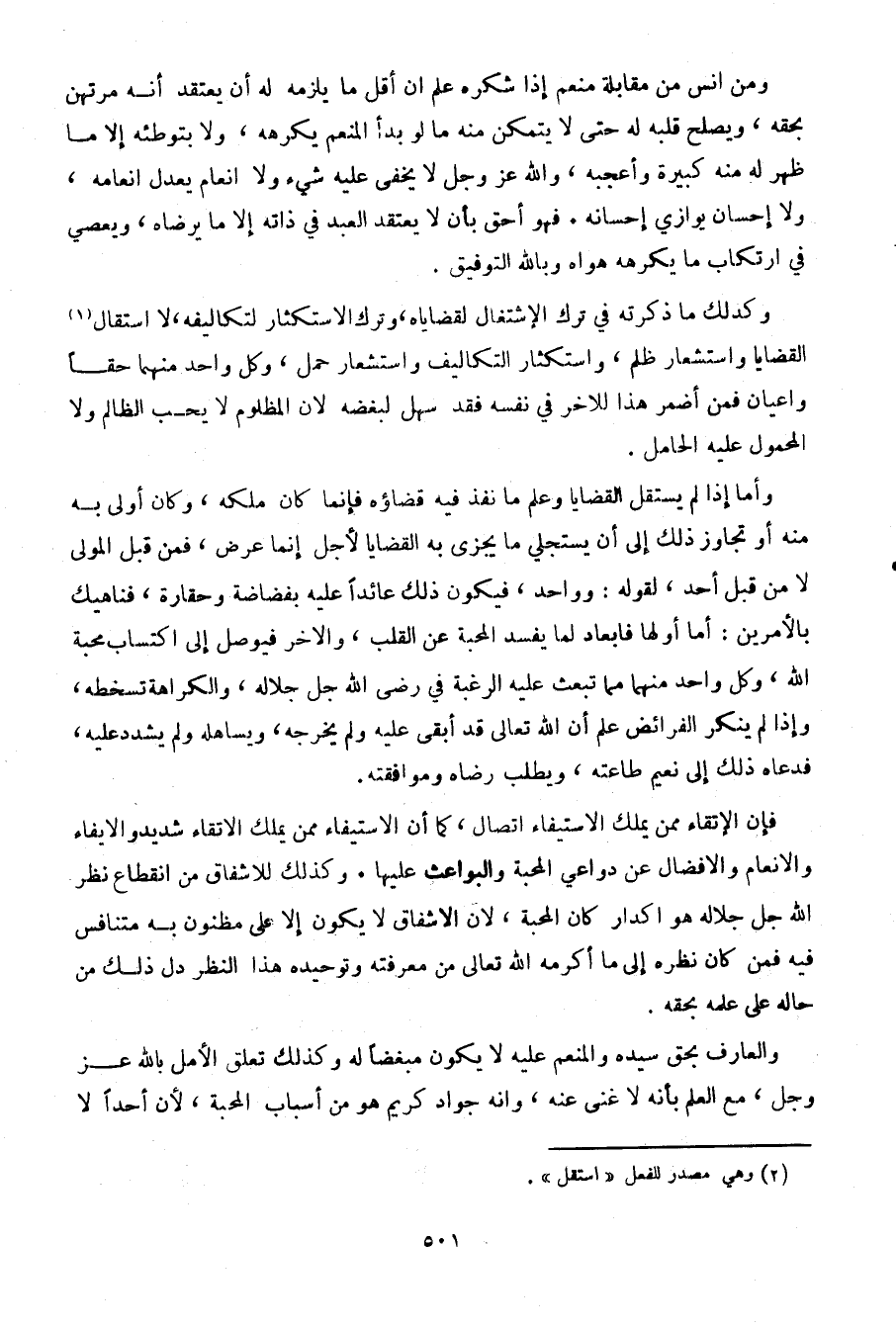 ومن أنس من مقابلة منعم إذا شكره علم أن أقل ما يلزمه له أن يعتقد أنه مرتهن بحقه، ويصلح قلبه له حتى لا يتمكن منه ما لو بدأ المنعم يكرهه، ولا بتوطئه إلا ما ظهر له منه كبيرة وأعجبه، والله عز وجل لا يخفى عليه شيء ولا إنعام يعدل إنعامه، ولا إحسان يوازي إحسانه. فهو أحق بأن لا يعتقد العبد في ذاته إلا ما يرضاه، ويعصي في ارتكاب ما يكرهه هواه وبالله التوفيق.
